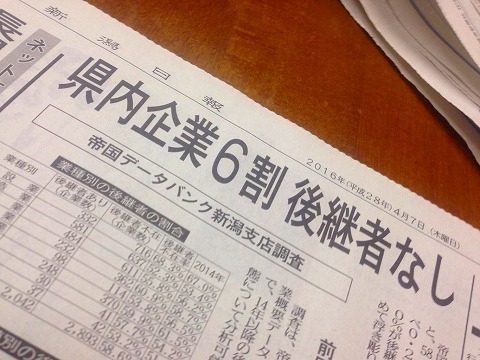 昨日の新潟日報に、新潟県内企業の6割が後継者不在という帝国データバンク新潟支店による調査結果が掲載されていた。